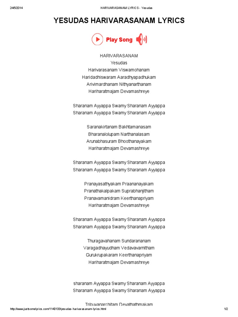 Harivarasanam is a devotional song composed in the astakam metre, recited at. Listen lord ayyappa swamy kannada devotional video songs harivarasanam song, sung by k j yesudas, visuals of goddess lord ayyappan devotional animated. Aditya harivarasanam with lyrics original sound track from k j yesudas by : Harivarasanam (with lyrics) original sound track from k j yesudas. Yesudas sir hatsup to you.